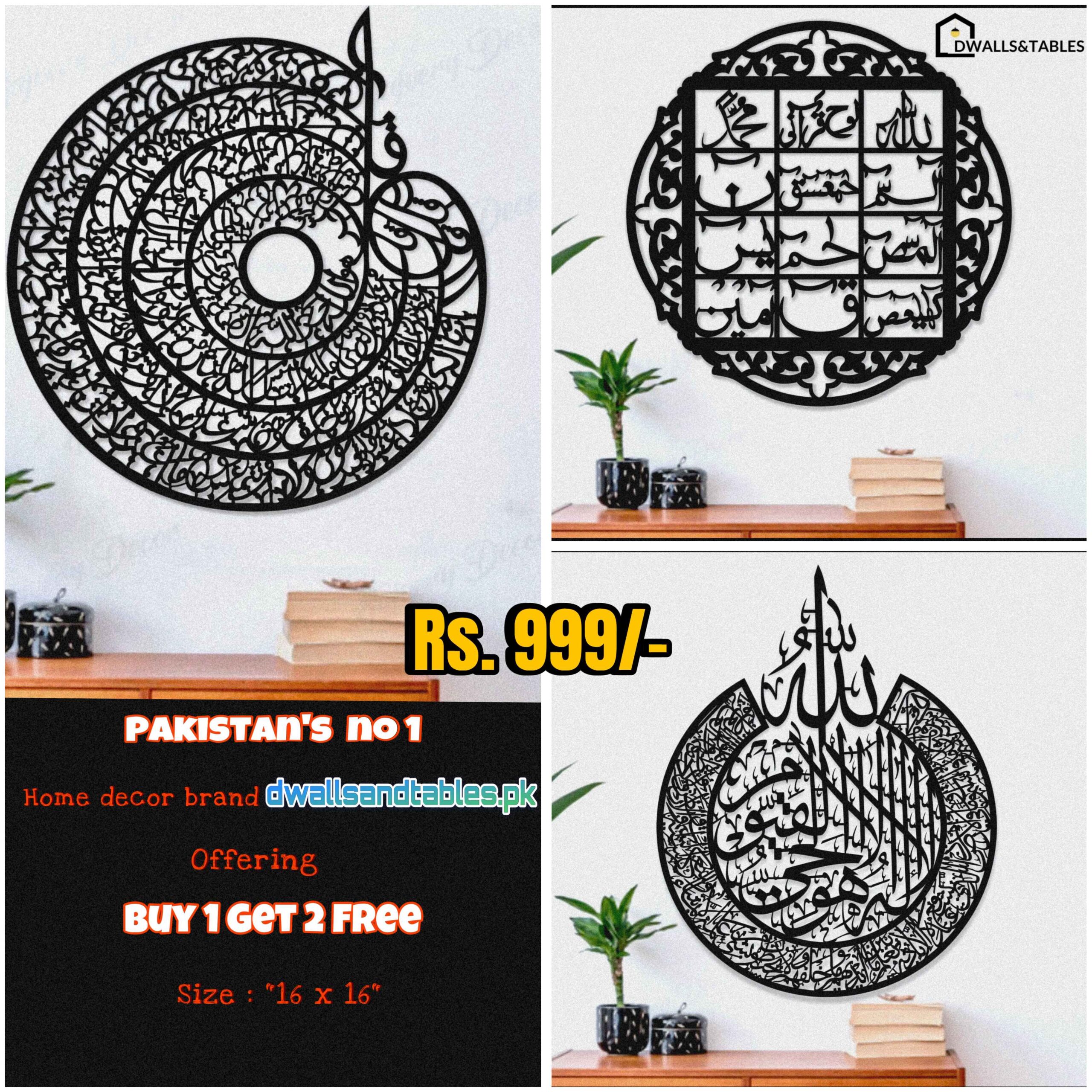 Elevate your space with the divine beauty of Islamic calligraphy! Purchase our stunning Four Qul Calligraphy and receive Ayat ul Kursi and Loh-e-Qurani absolutely FREE.