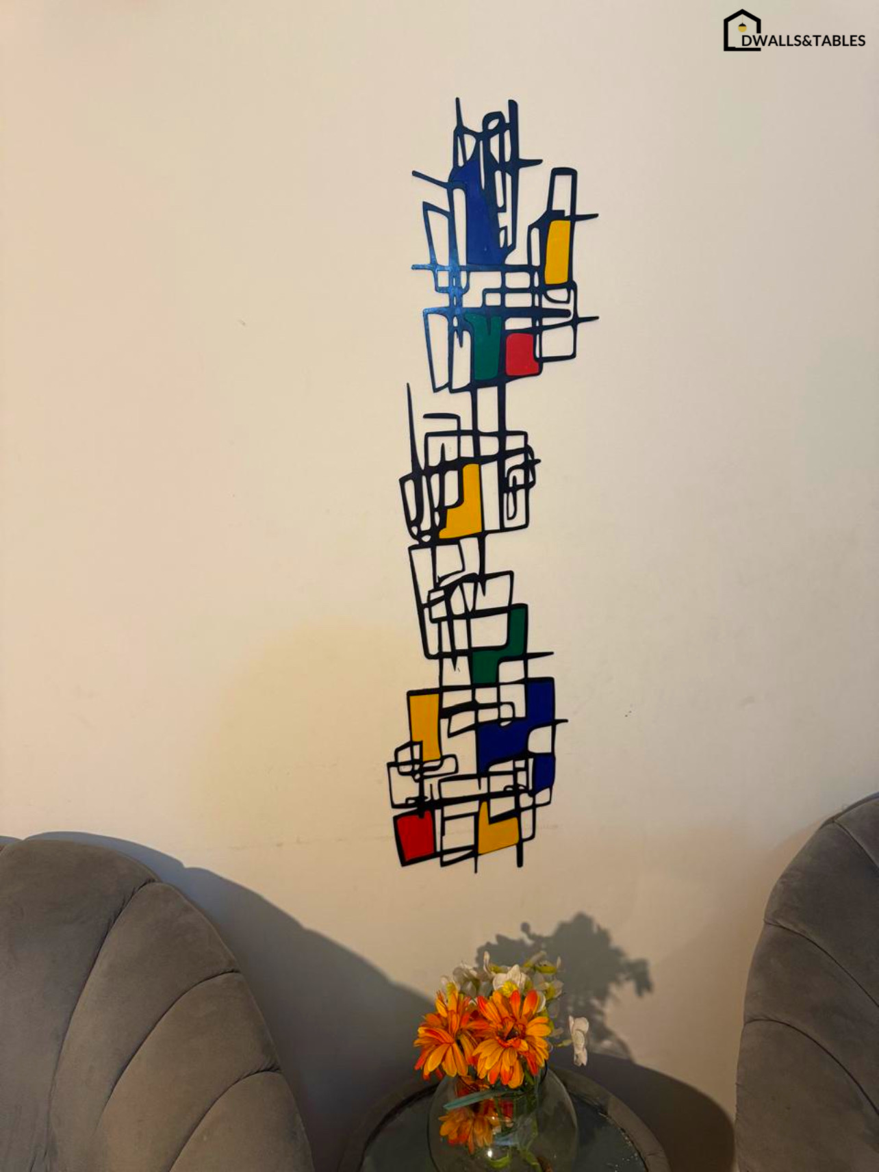 This wall piece features a unique arrangement of intersecting black lines and geometric shapes filled with primary colors like blue, red, yellow, and green. The minimalist design creates a striking contrast against neutral walls, while the vertical orientation adds height and sophistication to any space. Its abstract form draws the eye and invites interpretation, making it not just décor but a conversation starter.